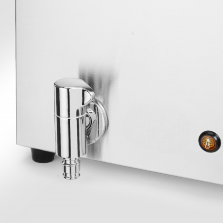 Bany Maria amb aixeta de buidatge, 3 recipients GN 1/3 amb tapa i temperatura ajustable de 30 °C a 85 °C. Disseny en acer inoxidable amb sistema de calefacció eficient.