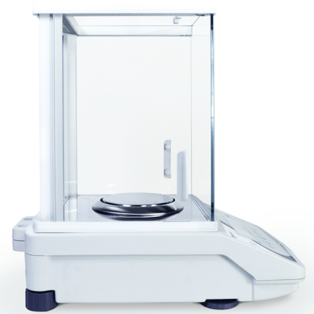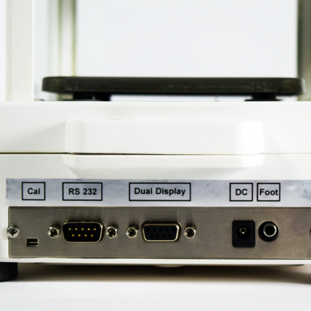 Balança analítica d'alta precisió amb pantalla extensible per evitar vibracions, amb pantalla LCD amb retroil·luminació blanca separada del cos de la balança.