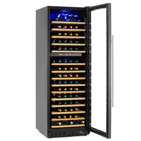 Aquesta vinoteca de doble zona de 160 ampolles és un refredador de vi professional ideal per a bars, restaurants i hotels que necessiten conservar cada ampolla a la temperatura de servei ideal. Gràcies a les seves dues zones de temperatura, permet ajustar dos rangs independents (5 a 22°C) per separar vins blancs i negres, escumosos o rosats, garantint una conservació estable, ordenada i a punt per al servei.