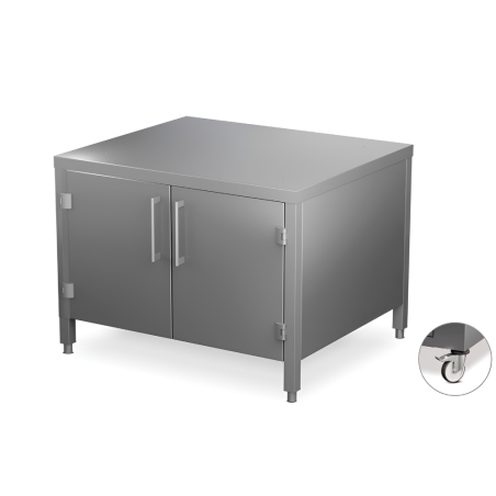 Forn de brasa d’exposició amb gran compartiment inferior d’emmagatzematge. Cos en acer inoxidable, rodes i control precís del flux d’aire per a brases segures i eficients en hostaleria.