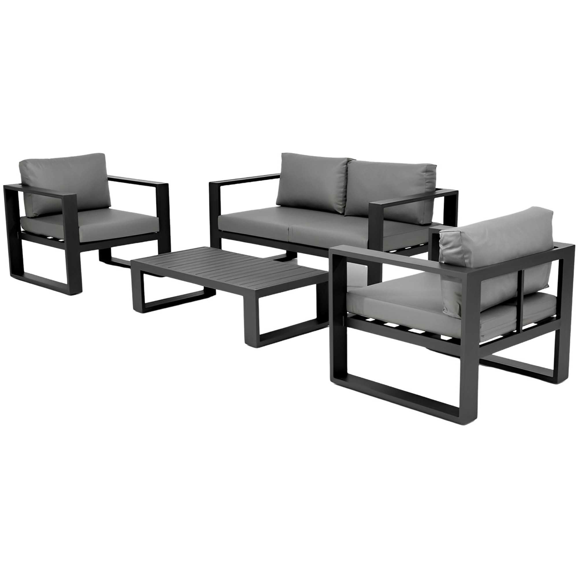 Els sofàs són fabricats en una estructura d'alumini antracita i els coixins en tela nàutica grisa, que és un material impermeable, resistent i fàcil de netejar.