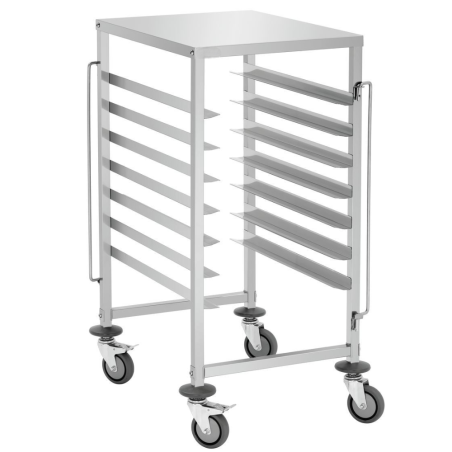 Carro professional d’acer inoxidable per a safates de 600x400 mm amb capacitat per a 7 ranures. Disseny segur i fàcil de manejar, amb subjecció a ambdós costats i rodes giratòries amb fre. Ideal per a hostaleria i fleca.