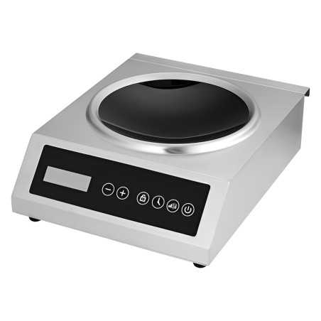 Wok d’inducció de sobretaula de 3500 W amb potència contínua per a ús professional. Control tàctil amb LCD, 20 nivells i rang 50–240 °C. Superfície vitroceràmica corbada per a salts i fregits d’alt calor.