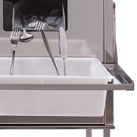 Model automàtic d'assecadora de coberts que asseca, poleix i elimina les restes de calç dels coberts, tant d'acer inoxidable com de plata, després del rentat.