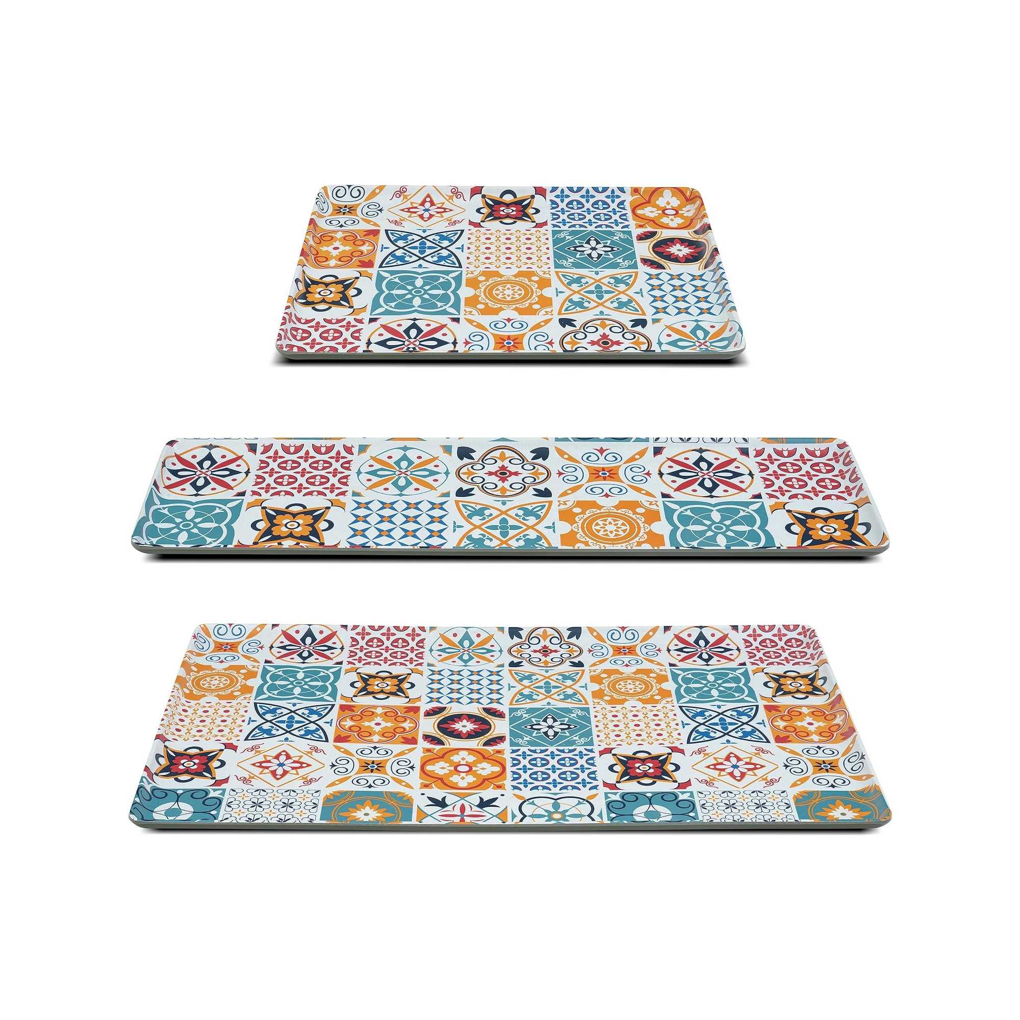 Safata de presentació de melamina amb un disseny hidràulic colorit inspirat en el mediterrani.