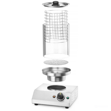 Escalfador de salsitxes professional amb recipient de vidre temperat i carcassa d’acer inoxidable. Ideal per a hostaleria, permet escalfar i exhibir salsitxes al mateix temps. Cistella amb divisor per a dos tipus de salsitxes. Termòstat ajustable de 30 °C a 100 °C.