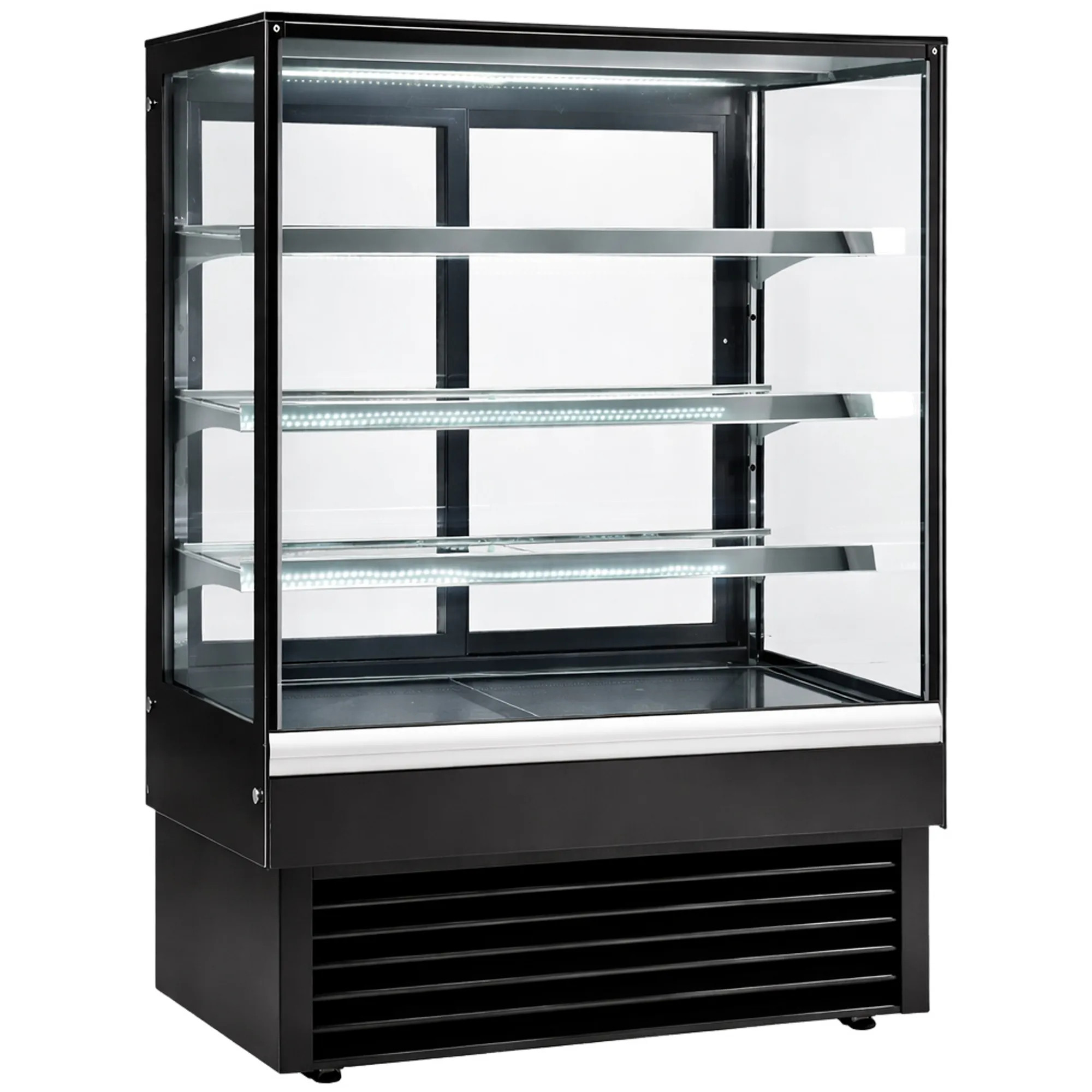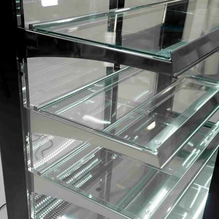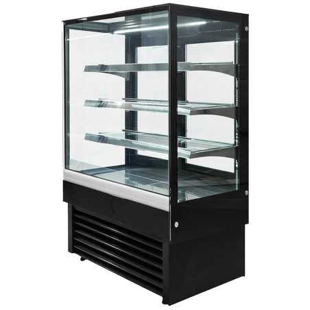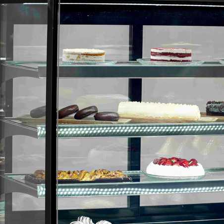 La vitrina expositora refrigerada per a pastisseria de 900 mm amb vidre recte està dissenyada per oferir una presentació elegant i professional de productes refrigerats. El seu disseny modern en acabat negre, juntament amb la il·luminació LED a cada prestatge, permet destacar els productes i potenciar la venda per impuls. Gràcies al seu sistema de refrigeració ventilada, garanteix una temperatura homogènia i una conservació òptima en tot moment.
