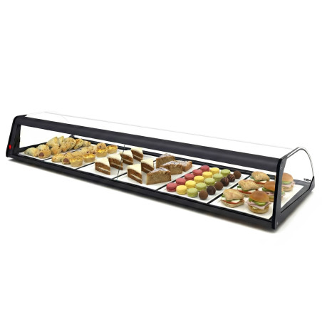 La Vitrina expositora neutra de vidre corbat és el complement perfecte per a negocis d'hostaleria que requereixen una exposició elegant i funcional per a productes que no necessiten refrigeració. El seu disseny minimalista i contemporani de vidre corbat maximitza la visibilitat dels aliments des de diferents angles, convertint-la en un expositor de taulell ideal per a reposteria i snacks frescos.