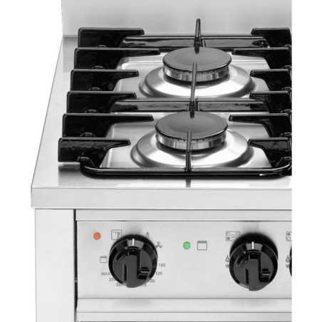This professional range with gas cooktop and electric convection oven with grill is the ideal solution for industrial kitchens, restaurants, and hotels requiring power, versatility, and durability. It features 5 gas burners of different outputs, removable cast iron grates, and an electric convection oven with grill, making it perfect for a wide variety of preparations.