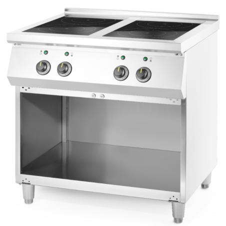 Professional induction cooker with 4 cooking zones, a total power of 17 kW, and stainless steel structure. Ideal for industrial kitchens and restaurants.