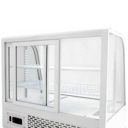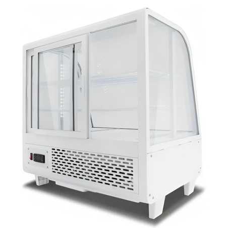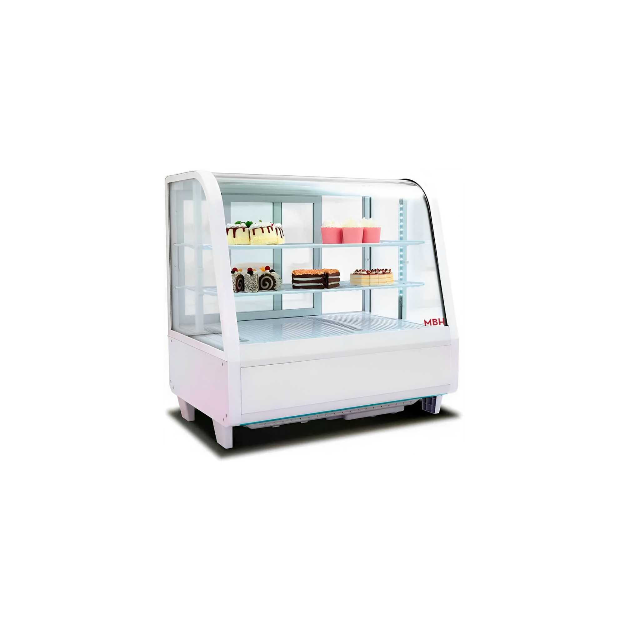 Countertop display case with 4 glass sides and curved front, perfect for beverages, desserts, and dairy products.