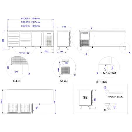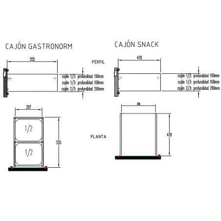 • Drawers with handle built-in stainless steel AISI 304 18/10 with perforated bottom. Fitted with telescopic rails with sufficient output to save the work plane