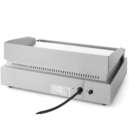 This professional griddle offers a large smooth cooking area of 518x328 mm, designed for intensive use in commercial kitchens. The 9 mm thick hard chrome surface ensures easy cleaning, while the stainless steel structure provides durability. With continuous temperature control up to 300 °C and overheating protection, it is ideal for safe and efficient continuous use.