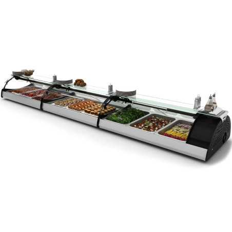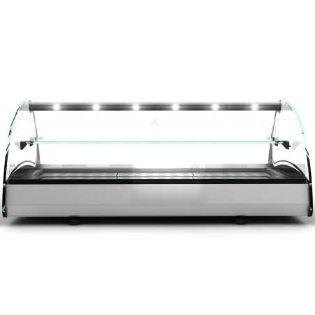 The lid warming display case with curved glass and dry heat system is designed to keep food warm at a constant temperature of +70°C. Ideal for buffets and pastry, pizza or churros counters, this display case stands out for its functional and elegant design, being a perfect solution for hospitality and catering businesses.
