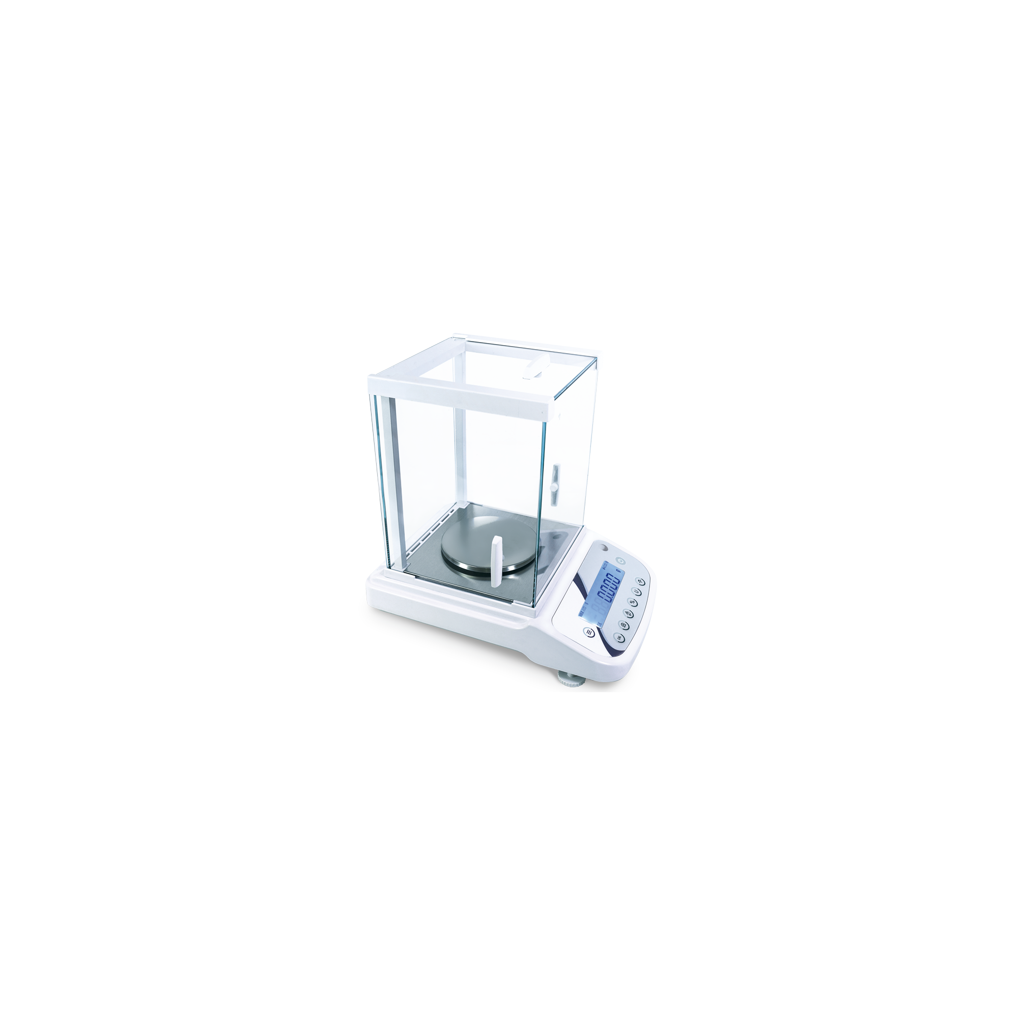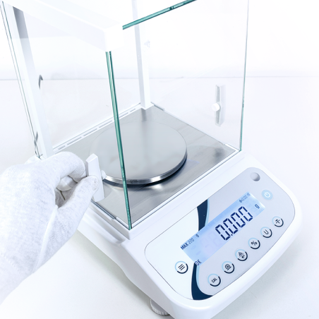 Precision balance with a transparent glass protector and an LCD display with 15mm digits.