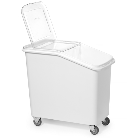 The ingredient cart is the perfect solution for storing, transporting, and quickly measuring dry food such as flour, sugar, salt, grains, or rice in professional kitchens. Its robust one-piece polyethylene structure ensures durability, while its transparent polycarbonate lid allows easy content identification. Equipped with wide rubber wheels for safe and easy transport.
