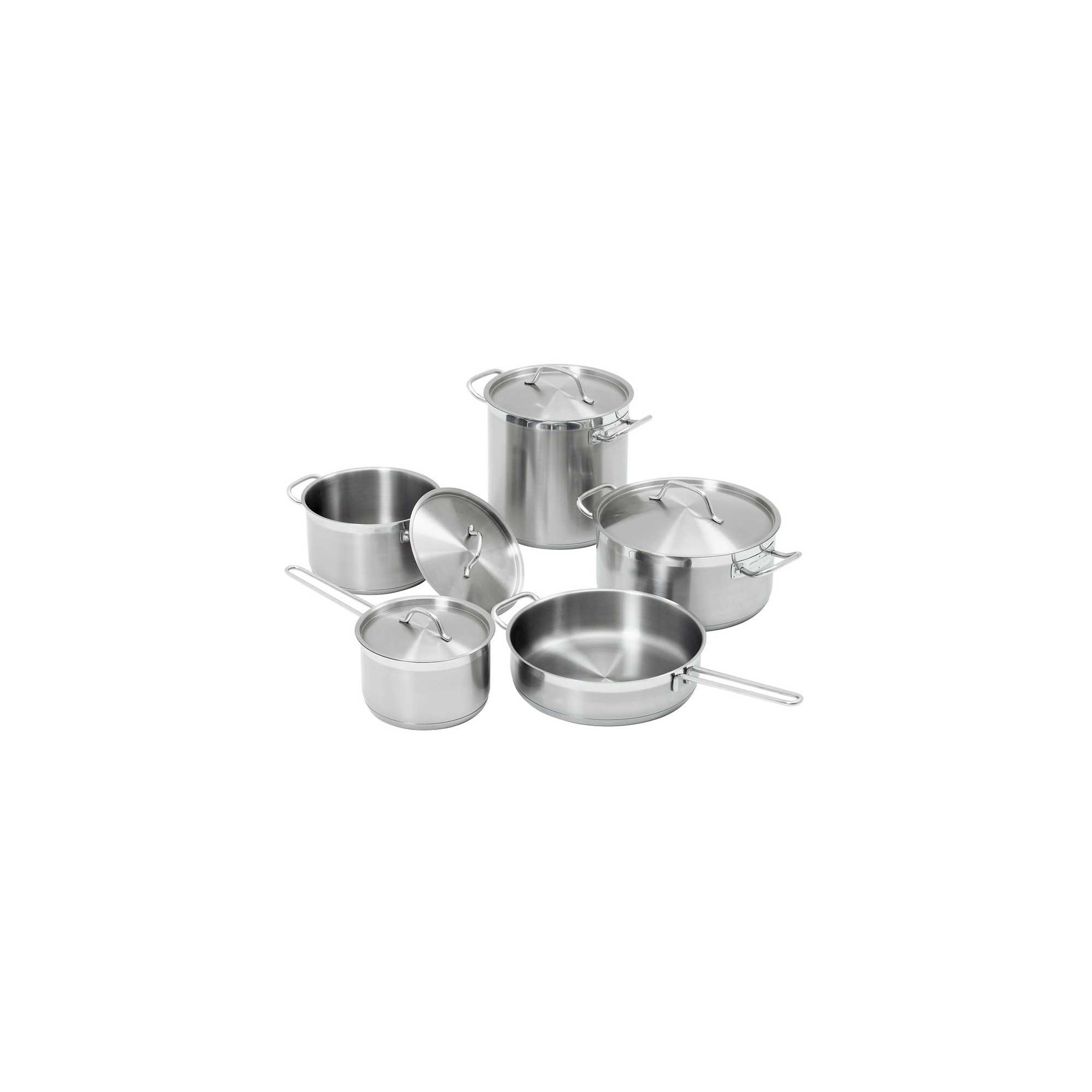Set of 4 pots with lids and 1 professional stainless steel frying pan, with capacities ranging from 2 to 6.1 liters. Suitable for all stove types, including induction, with cool-touch handles and spill-proof rims.