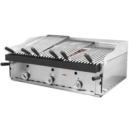 Barbacoa de 90 a gas de lava volcánica con peto, este modelo trabaja con 3 parrillas vascas inclinables o con una parrilla enteriza elevable en 3 alturas pavonadas o en acero inoxidable. Preparada para gas butano/propano. Incluye inyectores para gas natural.