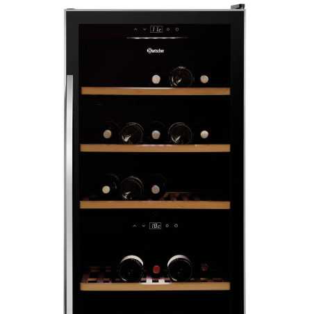 El refrigerador de vino profesional de gran capacidad está diseñado para cubrir las exigencias de bares, restaurantes y negocios de hostelería que necesitan almacenar grandes volúmenes de vino sin renunciar a una presentación elegante. Sus dos zonas de temperatura independientes permiten conservar vinos tintos y blancos en condiciones óptimas, mientras su diseño con puerta de cristal aporta visibilidad y estilo en cualquier entorno profesional.
