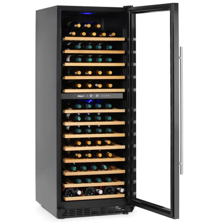 Esta vinoteca doble zona 135 botellas es un enfriador de vino profesional ideal para bares, restaurantes, hoteles y negocios HORECA que necesitan conservar cada botella a su temperatura ideal de servicio. Gracias a su doble zona de temperatura, permite ajustar dos rangos independientes (5 a 22°C) para separar vinos blancos y tintos, espumosos o rosados, manteniendo una conservación estable, ordenada y lista para el servicio.