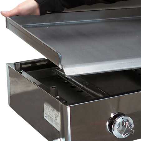 Cocina de dos fuegos con una plancha laminada de 40 x 40 centímetros con mueble de acero inoxidable y con aristas redondeadas, para facilitar su limpieza.