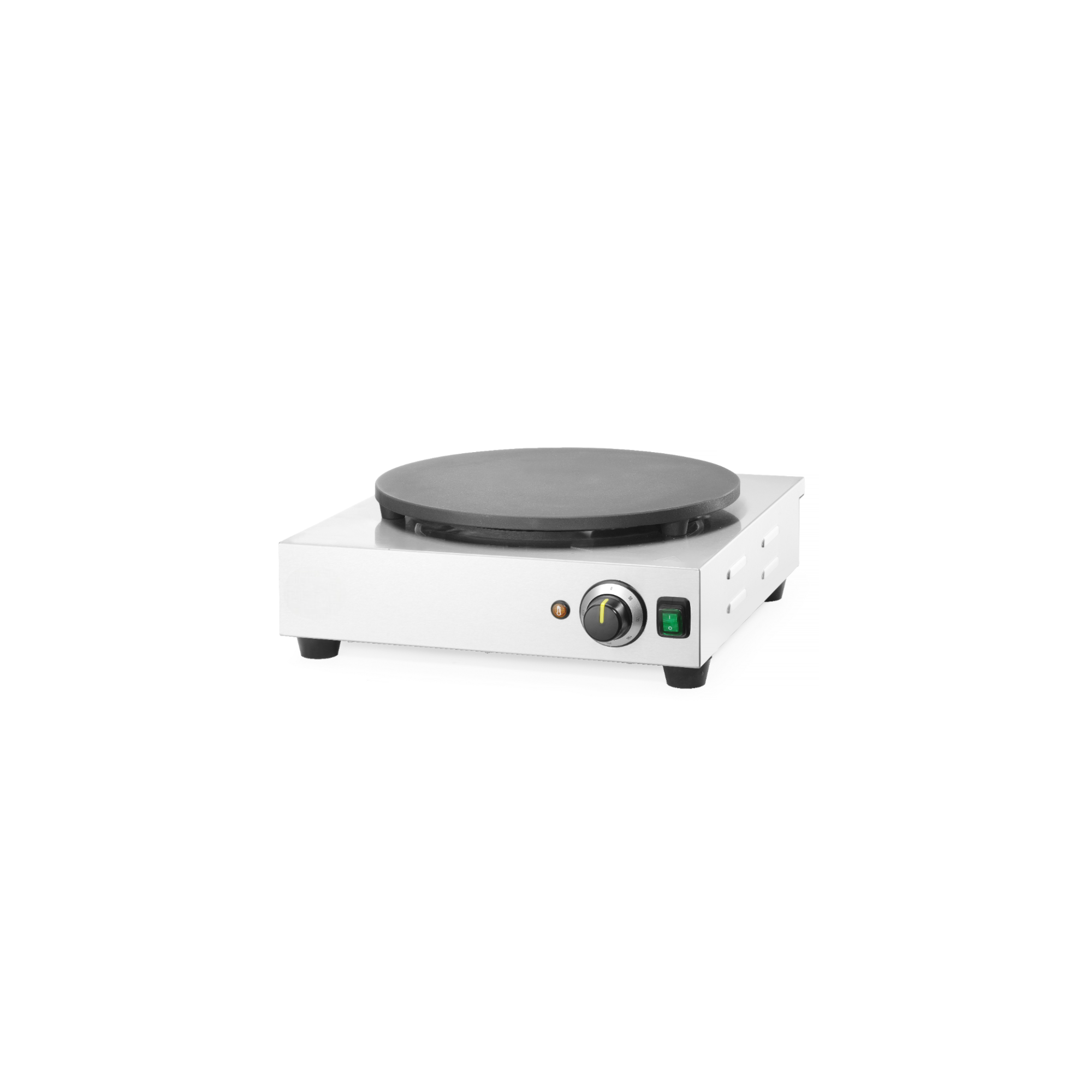 Crepera profesional diseñada para la elaboración de crepes perfectos en entornos de hostelería. Cuenta con una placa de cocción de 400 mm de diámetro fabricada en hierro fundido con revestimiento cerámico, lo que garantiza una excelente distribución del calor. Su estructura de acero inoxidable y su control de temperatura ajustable aseguran un uso intensivo, preciso y seguro.