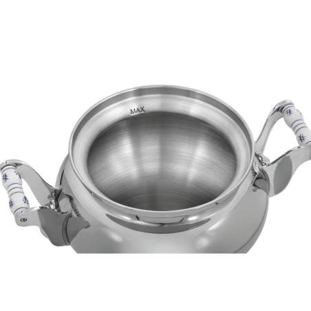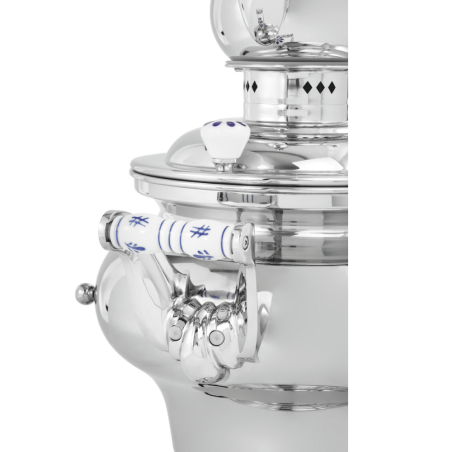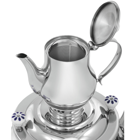 El samovar profesional de 15L combina una gran capacidad con un diseño clásico, ideal para hostelería, bares y cocinas industriales. Gracias a sus asas de cerámica ornamentadas y su sistema de doble resistencia, permite hervir el agua a 100°C y mantenerla caliente a 90°C, optimizando el consumo energético. Incluye tetera de acero inoxidable de 2L con colador de té para una preparación auténtica y eficiente.