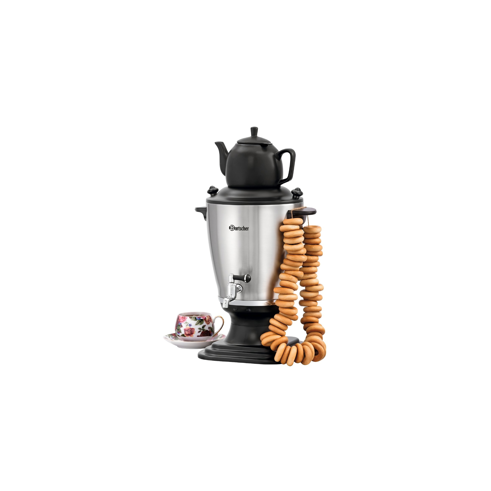 Disfruta del té con el samovar 3,2L. Hierve agua y mantenla caliente con sus dos resistencias de bajo consumo. Incluye jarra de loza y colador de té.