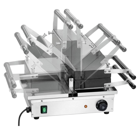 Gofrera profesional DELUXE con giro de 180° para una cocción uniforme. Placas de aluminio fundido con revestimiento antiadherente, control electrónico y temperatura ajustable hasta 300°C. Ideal para hostelería y negocios de repostería.