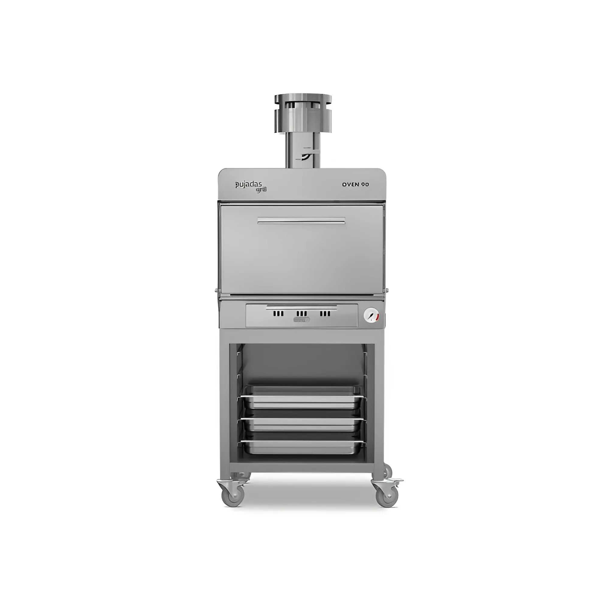 El horno de brasa profesional con bandejas GN está diseñado para ofrecer un alto rendimiento en cocinas profesionales. Con capacidad para preparar hasta 90 comensales, este horno garantiza eficiencia, movilidad y control total durante la cocción.