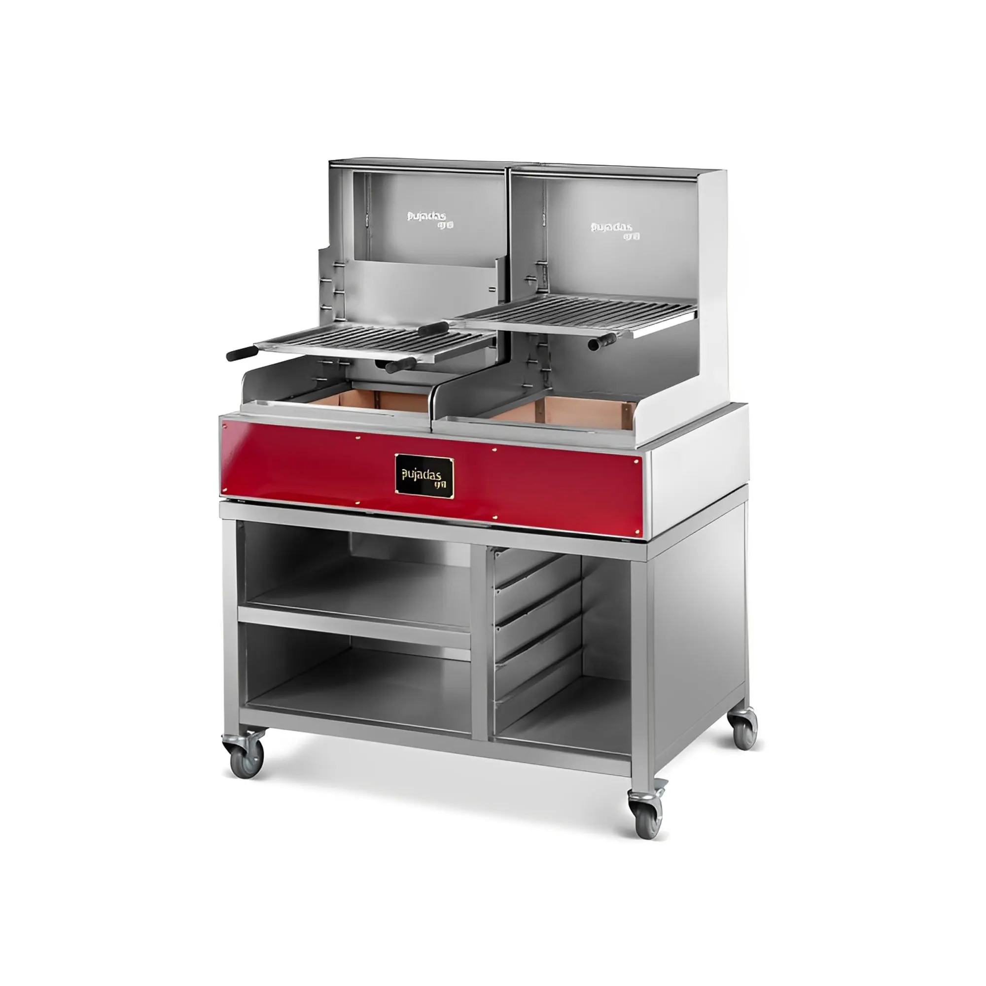 La Parrilla abierta profesional con altura regulable y estantes, con leñero ofrece un rendimiento culinario optimizado con leñero incorporado. Fabricada en acero inoxidable de alta calidad, esta parrilla dispone de una rejilla de barra con 5 niveles de cocción que permite una distribución homogénea del calor y facilita la gestión de la grasa. Su base de ladrillo refractario asegura la estabilidad térmica, mientras que las ruedas con freno y los estantes integrados la hacen práctica y funcional para cualquier cocina profesional.