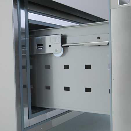 • Cajones con tirador incorporado en acero inoxidable AISI-304 18/10, con fondo perforado. Provistos de guías telescópicas con salida suficiente para salvar el plano de trabajo.