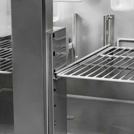 Esta mesa refrigerada de acero inoxidable es perfecta para cocinas industriales y profesionales. Su sistema de refrigeración ventilada garantiza una distribución uniforme del frío, mientras que el control digital Dixell o Eliwell permite ajustar la temperatura con precisión. Con una capacidad de hasta 260 litros y un rango de temperatura de -2°C a +8°C, es ideal para la conservación de alimentos en óptimas condiciones. Su diseño con puertas de cierre automático y juntas lavables y reemplazables facilita el mantenimiento y la higiene. Equipada con ruedas para mayor movilidad, también se puede convertir en una estructura fija con patas opcionales.