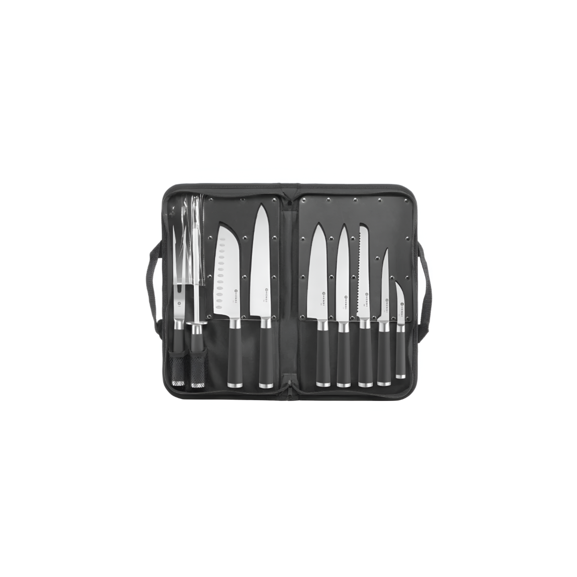 El juego de 9 cuchillos profesionales es ideal para chefs y cocinas de hostelería. Fabricados en una sola pieza de acero inoxidable 3Cr13, ofrecen alta resistencia a la corrosión y un filo duradero. Su mango de acero inoxidable 430 con revestimiento de goma antideslizante garantiza un agarre seguro y cómodo. Incluye un práctico maletín de transporte para una mejor organización y protección de las herramientas.