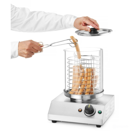 Calentador de salchichas profesional con recipiente de vidrio templado y carcasa de acero inoxidable. Ideal para hostelería, permite calentar y exhibir salchichas al mismo tiempo. Cesta con divisor para dos tipos de salchichas. Termostato ajustable de 30 °C a 100 °C.