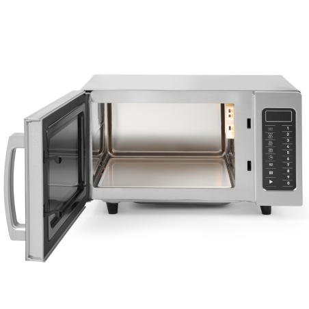 Four à micro-ondes professionnel 1000W avec capacité de 23L, 10 programmes prédéfinis et mémoire de 100 programmes. Conception en acier inoxydable.