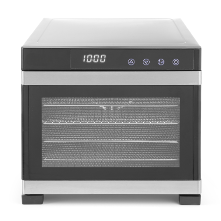 Déshydrateur alimentaire professionnel avec 6 plateaux en acier inoxydable et contrôle digital. Température réglable de 35°C à 75°C et minuterie jusqu’à 24 heures. Idéal pour fruits, légumes, herbes et viandes en hôtellerie et gastronomie.