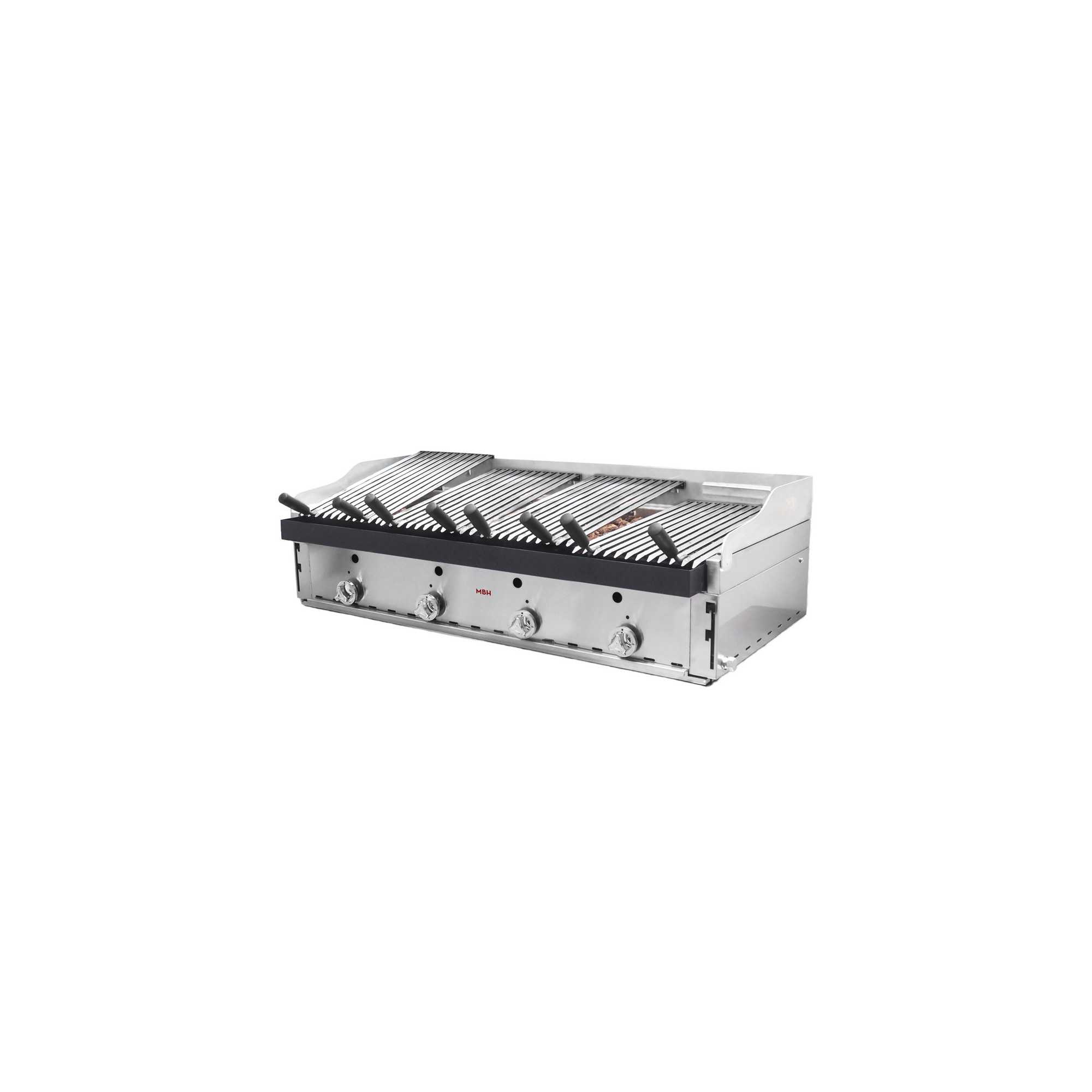 Barbecue à gaz 120 avec parapet, en lave volcanique, ce modèle fonctionne avec 4 grilles individuelles pouvant être relevées à 3 hauteurs bleuies. Préparé pour le gaz butane/propane. Comprend des injecteurs pour le gaz naturel.