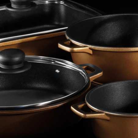 Le pack comprend un plat à rôtir, une cocotte basse et deux cocottes hautes, de couleur bronze, hautement résistantes aux chocs et à la déformation, offrant d'excellentes performances thermiques et un revêtement antiadhésif résistant à l'abrasion.