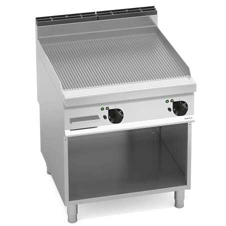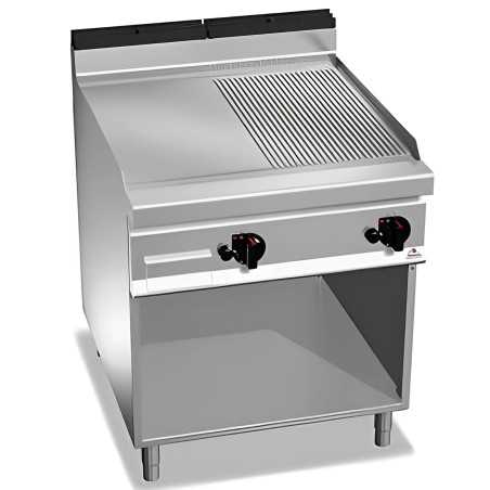Cuisinière à gaz FRY TOP 800 en acier rectifié avec plaque lisse, rainurée ou moitié-moitié MACROS 700 avec armoire.