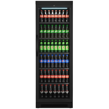 Vitrine vitrée verticale noire 358L, idéale pour l'exposition de boissons en salle ou bar. Froid positif ventilé et gaz R600a pour une température homogène et une mise en valeur parfaite de vos produits frais.