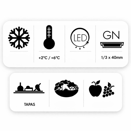 La vitrine réfrigérée à tapas 2 niveaux est un expositor professionnel pensé pour les comptoirs à forte rotation, où la présentation et la conservation sont essentielles. Disponible en versions pour 4, 6 ou 8 bacs GN 1/3, elle permet de maintenir le produit au froid et prêt au service dans les bars et restaurants, avec une excellente visibilité grâce à son design à double niveau. De plus, il existe aussi l’option cuve plane, disponible dans toutes ses couleurs (sélectionnez l’option dans le menu déroulant).